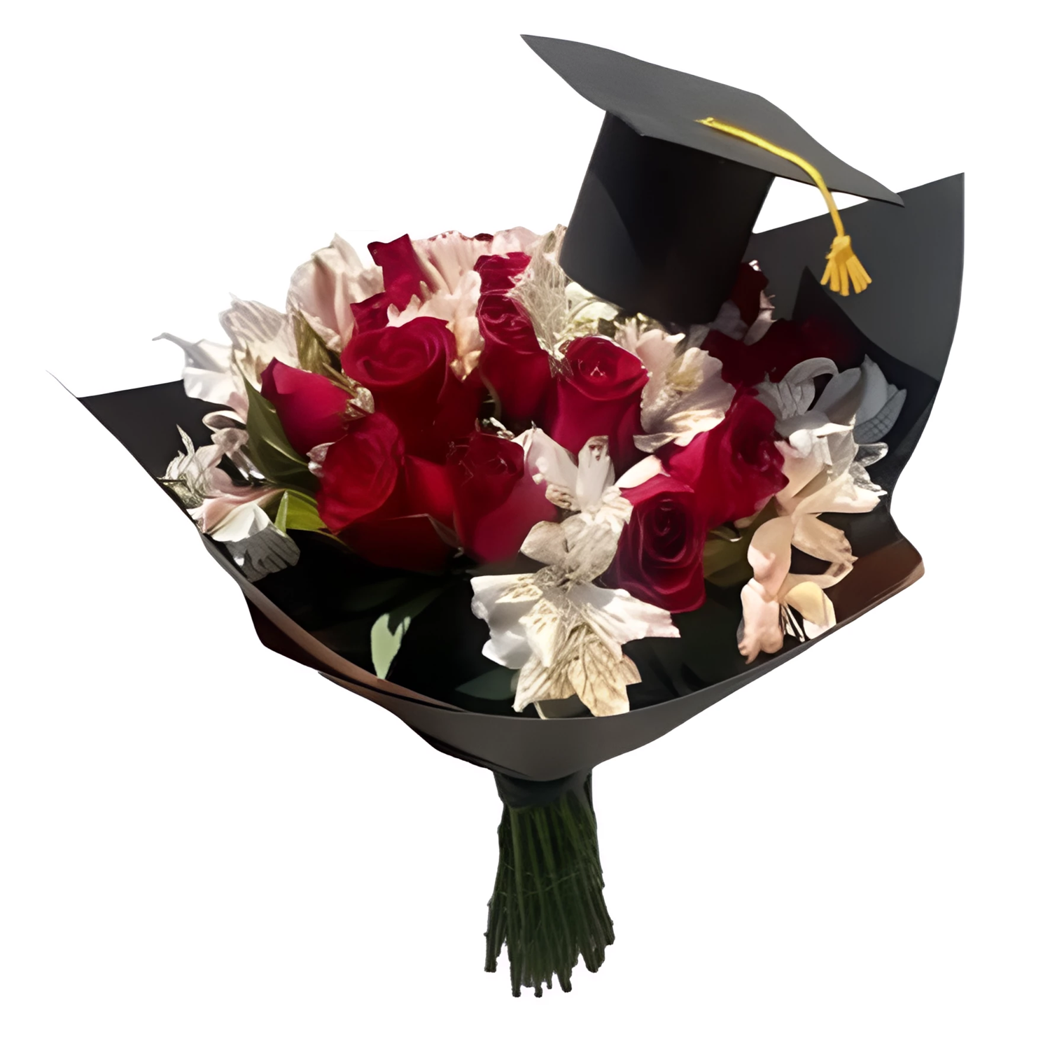 Bouquet de 15 rosas y astromelias, con papel, moño, tarjeta y aplique de grado