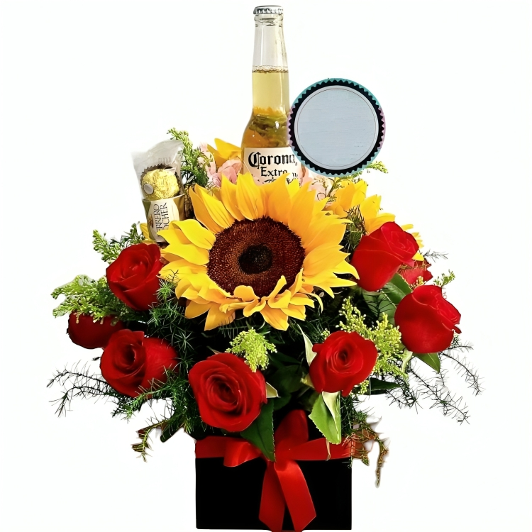 Caja con 18 rosas del color de su preferencia, girasol, cerveza Corona, chocolates Ferrero x 3 unidades y tarjeta