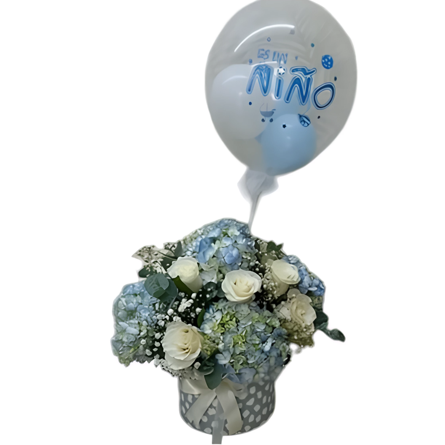 Arreglo redondo de hortensias y rosas, follaje variado y globo, todo reunido en caja decorativa