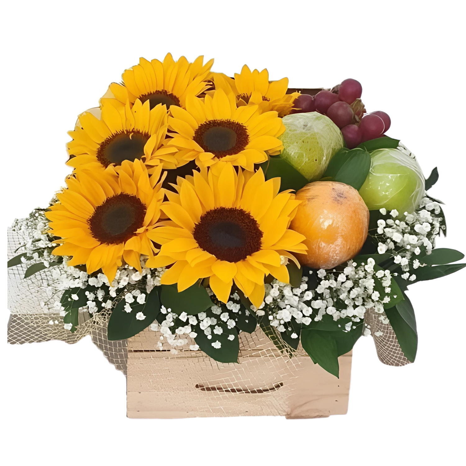 Base de madera con tapizado de 6 girasoles, follaje, racimo de uvas, y 5 frutas personales