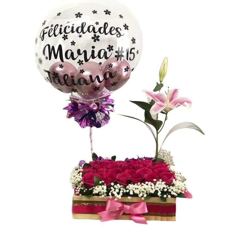 Tapizado de 18 rosas de su color favorito en base de madera con follaje variado, globo burbuja, moña y tarjeta