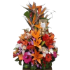 Arreglo elaborado con 18 Gerberas, colores sujetos a disponibilidad, en base de madera con follaje y tarjeta